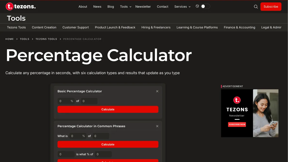 Tezons Tools are free, browser-based utilities built and maintained by Tezons for business owners, marketers, and creators. No login or subscription is required to use them. The range includes calculators, generators, and practical utilities relevant to everyday digital growth and business operations.